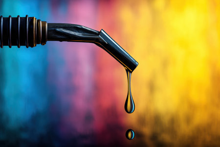 A shiny black fuel nozzle hangs over a colorful surface while dripping oil, highlighting the vibrant background and the fluids glossy texture.
