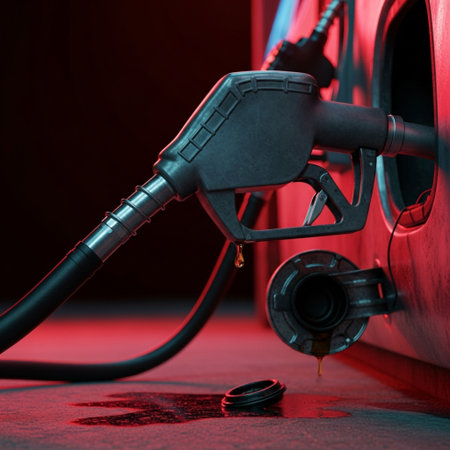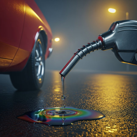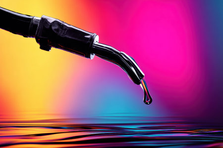 A glossy black fuel nozzle hangs in mid-air, dripping dark oil onto a strikingly vibrant background. The colors create a vivid contrast, highlighting the fuel.