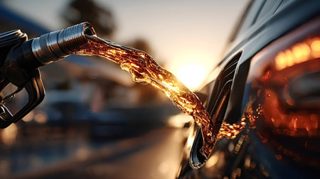 Fuel is flowing from a gas pump nozzle into a car's tank at sunset, creating a visually appealing stream of liquid illuminated by golden light