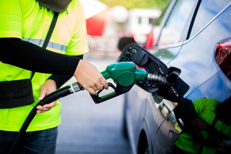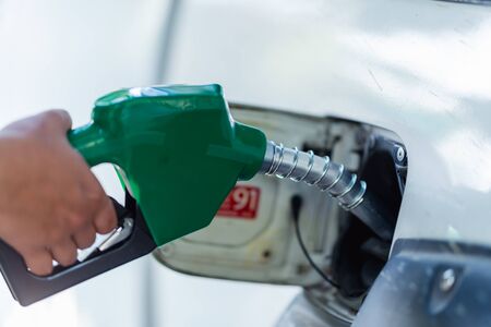 refueling Car fill with petrol gasoline at gas station and petrol pump filling fuel nozzle in fuel tank of car