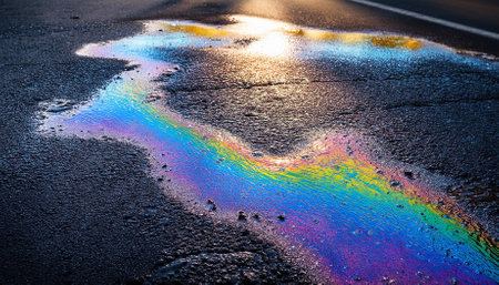 Spilled Gasoline Forming a Hazardous Rainbow on Asphalt. Concept Gasoline Spill, Rainbow Colors, Hazardous Materials, Asphalt, Environmental Danger