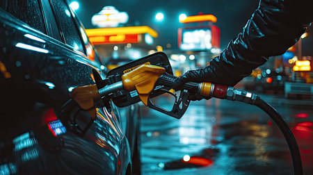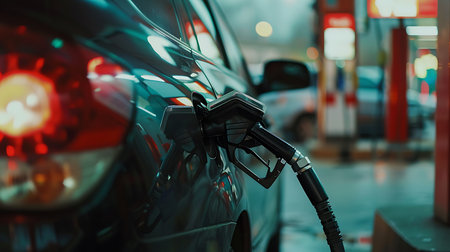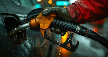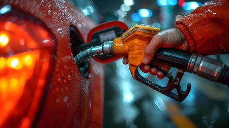 A close-up view of a hand gripping a fuel nozzle, preparing to refuel a car at a service station, showcasing the process of fueling in daily life.