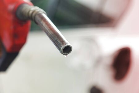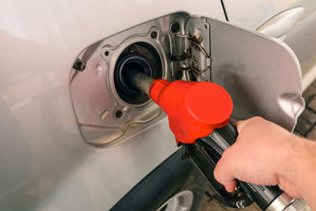 Pumping petrol at gas station into vehicle. Hand holding a red pistol to refuel car with gasoline.
