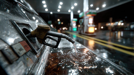 A close-up view of a gasoline pump delivering fuel at a service station during a rainy night, with vibrant reflections emphasizing urban life.