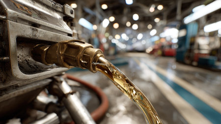 This image captures a detailed close-up of dark oil flowing from industrial machinery, set in a workshop environment with a soft bokeh backdrop, showcasing industrial technology.