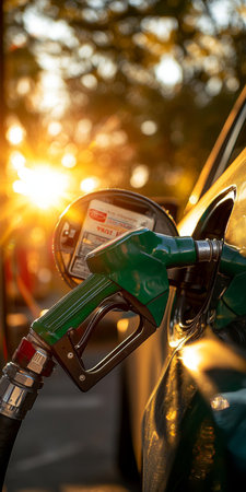 Close-Up Green Fuel Nozzle Pumping Gas into Car at Sunset, Emphasizing Energy and Transportation