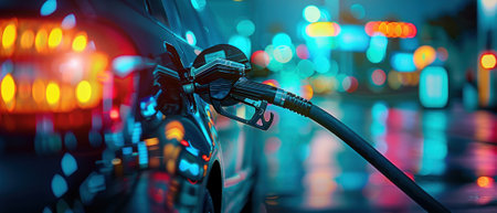 A vibrant nighttime scene of a car being fueled, with colorful reflections and a modern urban atmosphere.