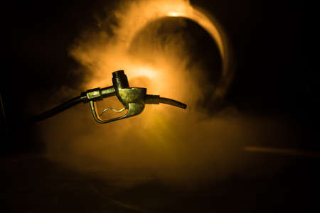 Creative concept. Silhouette of gasoline pistol miniature on dark toned foggy background. Fuel gun close up burning. Selective focus