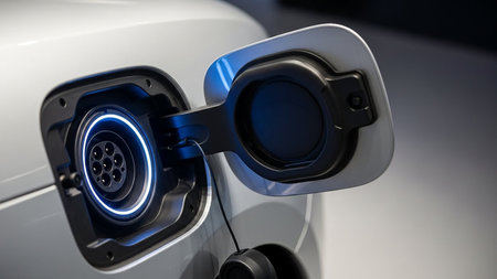 A close-up view of an electric vehicle charging connector being inserted into a car