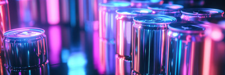 Bright neon lights illuminate an arrangement of energy drink cans, creating a vibrant cyberpunk atmosphere filled with electric blue and purple reflections.