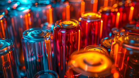 Vibrant Energy Concept with Close up of Red and Blue Metal Batteries Illuminated with Colorful Lighting AI Generative