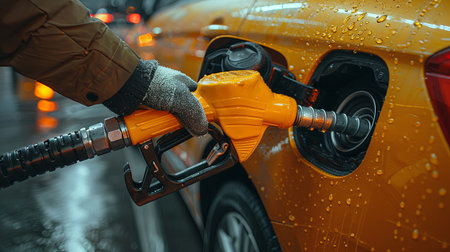 Close-up of a person refueling a yellow car with a gasoline pump at a service station. Hand and yellow refueling gun close-up, Generative AI.