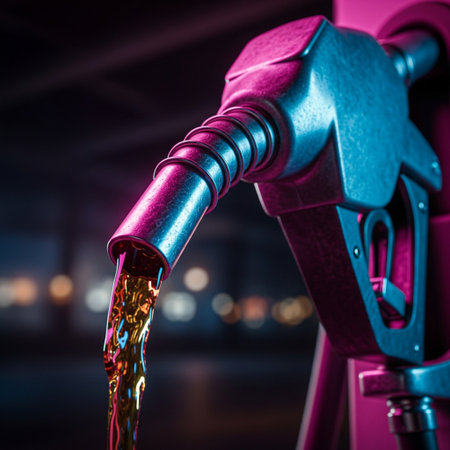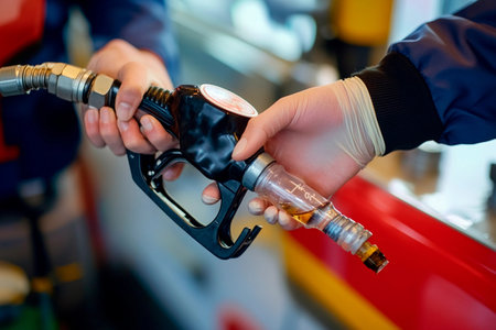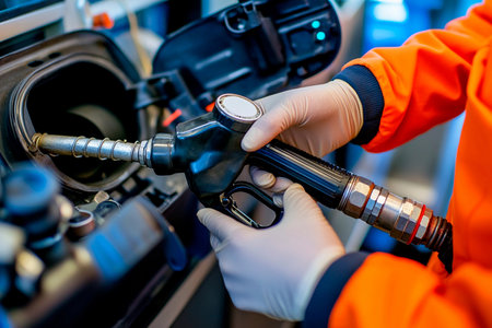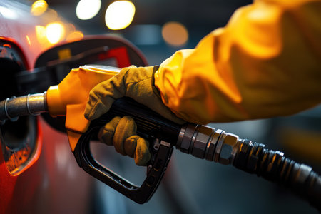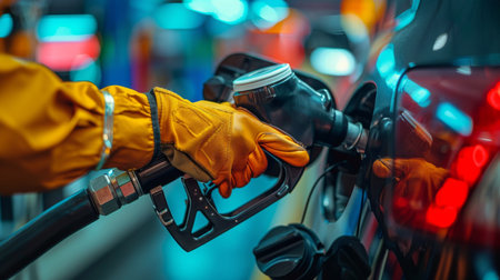 A vivid close-up depicting the hands of a gas station attendant wearing gloves for safety,