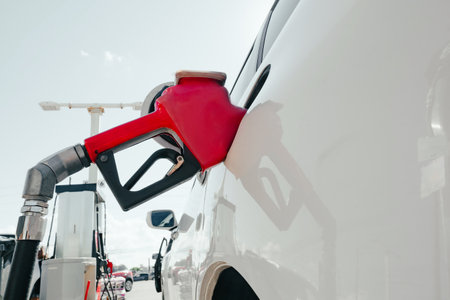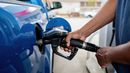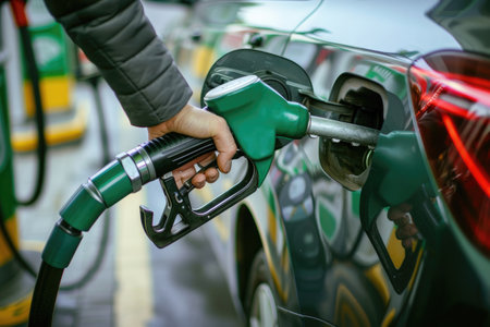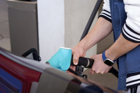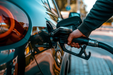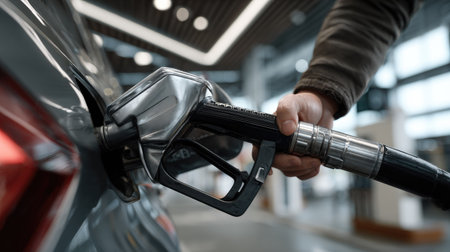 A closeup view of a hand holding a fuel nozzle while filling a car at a modern gas station. The image captures the interaction between driver and fuel pump in a bright, clean environment.