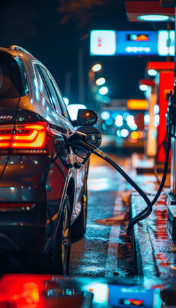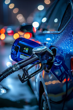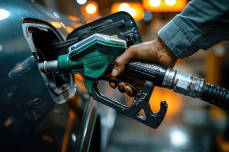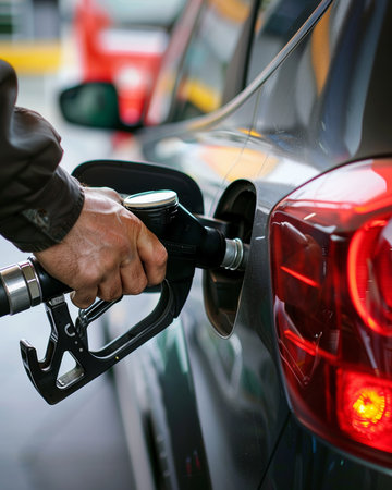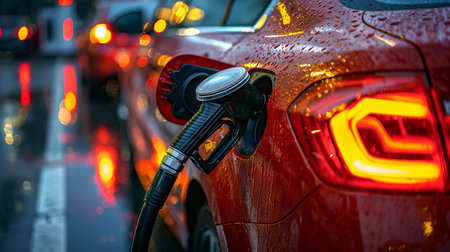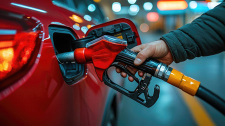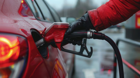 A close-up shot of a hand gripping a petrol gun, poised to refuel a shiny red car at a modern gas station, capturing the action and convenience of filling up.