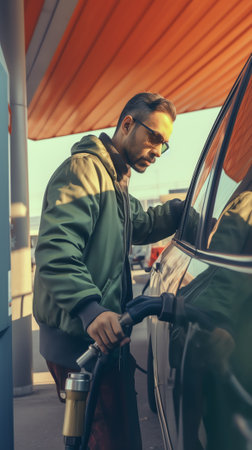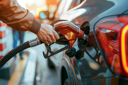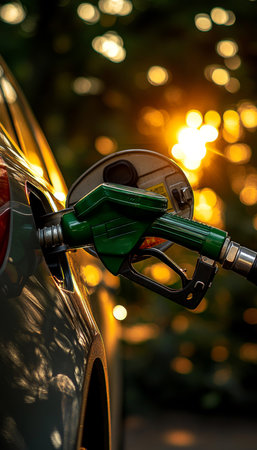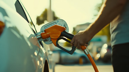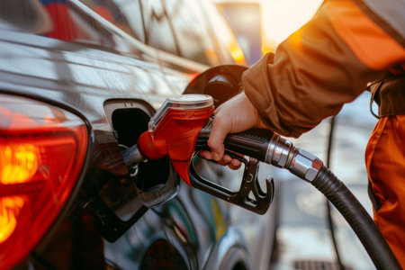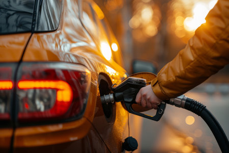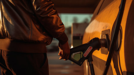 Close up of a drivers hand refueling a car at a gas station, with the setting sun casting a warm glow on the scene, highlighting the importance of fuel in modern transportation