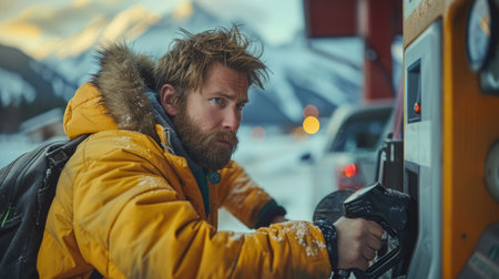 A male in a yellow jacket refueling his vehicle at a snowy gas station with mountains in the backdrop.