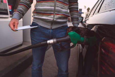 Man fills petrol into the car at a gas station. Man hand holding a fuel pump at a station