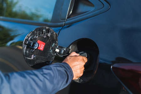Close up cropped image of male hands, holding filling gun, and opening fuel tank of his luxury car, ready to refueling the car at petrol station.