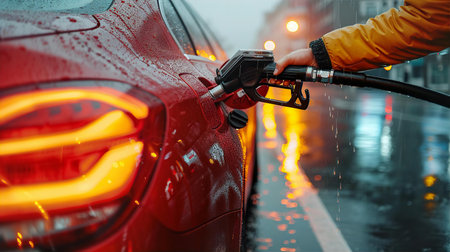 A person holds a fuel nozzle while refueling a car at a gas station on a rainy day. The droplets on the vehicle emphasize the challenging weather conditions.