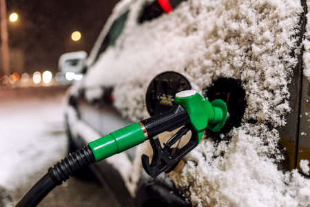 Snow covered car refueling at the gas station at night