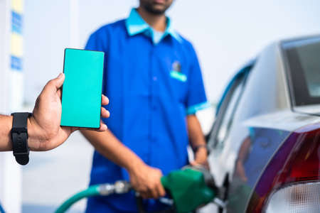 close up shot of hand showing green screen mobile phone while worker filling petrol on car - concept of application advertisement, promotion and offers.