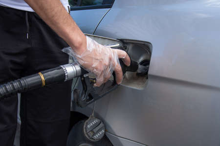 Coronavirus gas oil prices dropping man pumping gasoline at gas station wearing medical blue glove as COVID-19 spreading safety protection for touching germs.