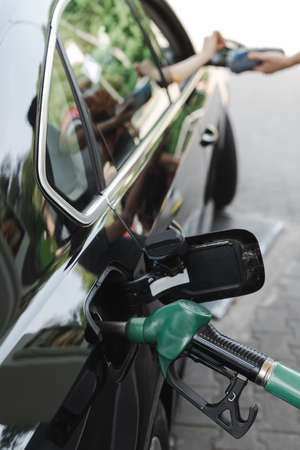 Pumping gasoline fuel in black car at gas station , Gas pump nozzle. Fuel gasoline car in gas station, to fill the machine with fuel.