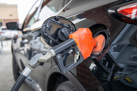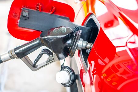 Process of refueling a car fill with petrol fuel at the gas station, pump filling fuel nozzle in fuel tank of car, high price of petrol and oil fuel, economic concept