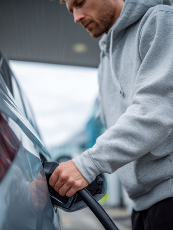 A relaxed individual in a hoodie refuels his sleek car under bright daylight, capturing the precise moment his hand pushes the nozzle into the fuel port.
