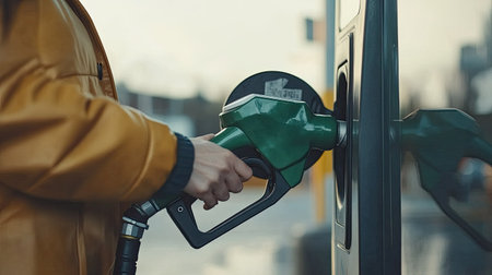 Closeup of a woman's hand holding a green gasoline pump, refueling her car at a self-service gas station with a modern backdrop.