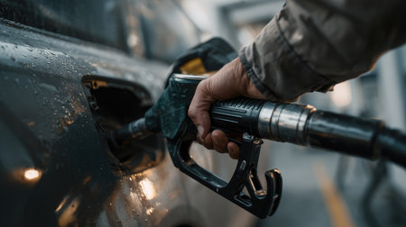 Close-up of a hand holding a fuel pump nozzle, inserting it into a car's gas tank at a service station