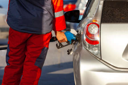 Man pumping gasoline car at gas station being filled with fuel on closeup