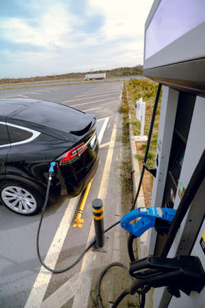 Electric vehicle charging near the EV charging station. Zero emission cars. EV chargers. alternative energy. Fast AC EV charger. Plugged in electric car on the station.