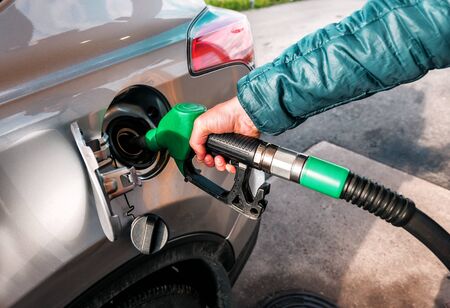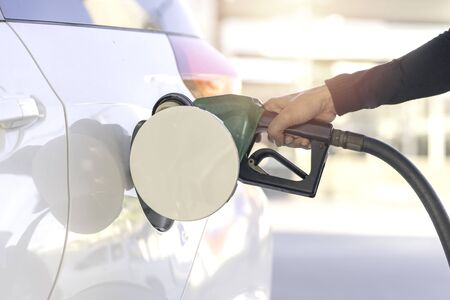 Person holding gas nozzle pumping gasoline fuel in car at gas station