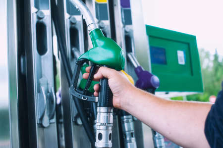Man's hand holds Fuel pistols at petrol station