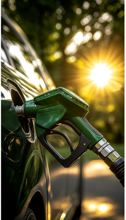 Green Fuel Nozzle Filling Car, Golden Hour Sunburst, Eco Friendly Transportation Concept