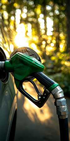 Close-Up Green Fuel Nozzle Pumping Gas into Car at Sunset, Emphasizing Energy and Transportation