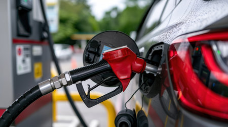 Close-up image of a red fuel pump nozzle inserted into a car's fuel tank, capturing the essence of daily refueling at a busy gas station.