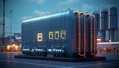 A serene view of industrial storage tanks illuminated by the soft glow of sunrise, reflecting beautifully on calm waters, showcasing nature's harmony with industry.