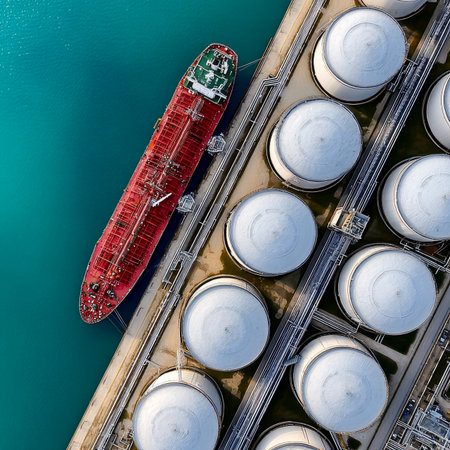 Aerial View Capturing Oil Tanker Docked Beside Coastal Petroleum Storage Facilities and Equipment