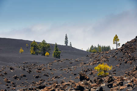Beautiful volcanic landscape in Tenerife. Trees growing in the middle of black lava field. Chinyero Volcano, Canary Islands, Spain.