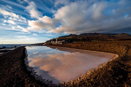 Volcanic pool on the salt manufaturing with pink salt water and sky reflection on La Palma island