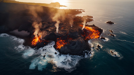 Dramatic fiery volcanic eruption at sunset