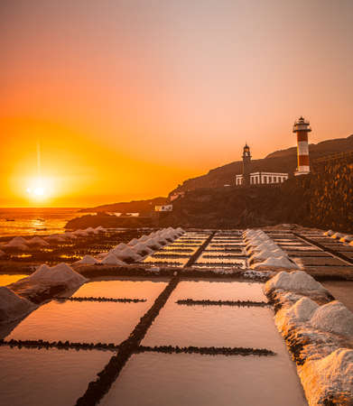 Beautiful sunset at the Fuencaliente Lighthouse next to the salt flats, on the route of the volcanoes south of the island of La Palma, Canary Islands, Spain