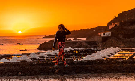 A young woman walking in the orange sunset in the salina and in the background the Fuencaliente Lighthouse on the route of the volcanoes south of the island of La Palma, Canary Islands, Spain