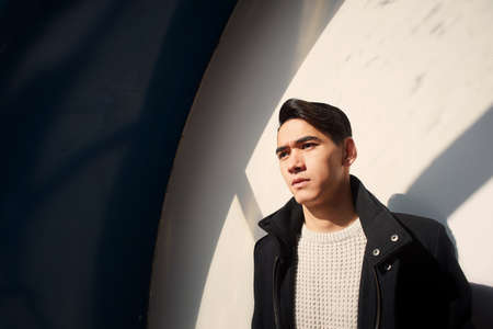Portrait of a handsome young man in a dark room. Men's fashion.