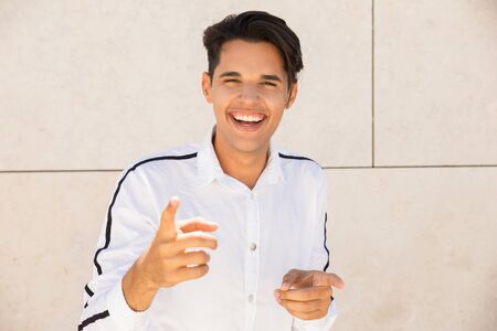Joyful young Latin man pointing at you at wall outdoors. Handsome young guy wearing shirt and looking at camera with building wall in background. Joyful guy portrait concept. Front view.