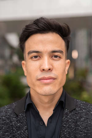 Face of serious bearded caucasian armenian young man looking at camera. Attractive guy stand on street city lifestyle. People. Beauty. Stand outdoors