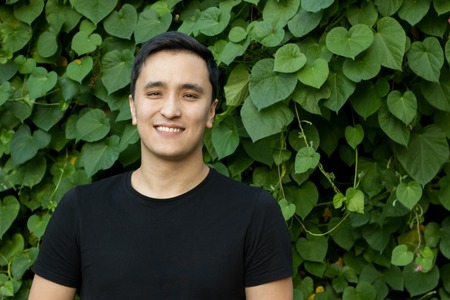 Portrait of a handsome positive young Kazakh man on a background of nature.